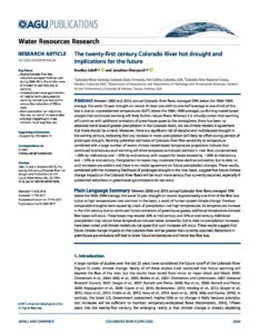 Between 2000 and 2014, annual Colorado River flows averaged 19% below the 1906–1999 average, the worst 15-year drought on record. At least one-sixth to one-half (average at one-third) of this loss is due to unprecedented temperatures (0.9°C above the 1906–1999 average), confirming model-based analysis that continued warming will likely further reduce flows. Whereas it is virtually certain that warming will continue with additional emissions of greenhouse gases to the atmosphere, there has been no observed trend toward greater precipitation in the Colorado Basin, nor are climate models in agreement that there should be a trend. Moreover, there is a significant risk of decadal and multidecadal drought in the coming century, indicating that any increase in mean precipitation will likely be offset during periods of prolonged drought. Recently published estimates of Colorado River flow sensitivity to temperature combined with a large number of recent climate model-based temperature projections indicate that continued business-as-usual warming will drive temperature-induced declines in river flow, conservatively −20% by midcentury and −35% by end-century, with support for losses exceeding −30% at midcentury and −55% at end-century. Precipitation increases may moderate these declines somewhat, but to date no such increases are evident and there is no model agreement on future precipitation changes. These results, combined with the increasing likelihood of prolonged drought in the river basin, suggest that future climate change impacts on the Colorado River flows will be much more serious than currently assumed, especially if substantial reductions in greenhouse gas emissions do not occur.
