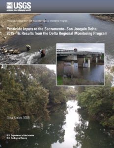 In July 2015, the U.S. Geological Survey in cooperation with the Delta RMP began measuring concentrations of 154 pesticide compounds in monthly samples of surface water and suspended sediment collected at five major inputs to the Sacramento–San Joaquin Delta from July 2015 to June 2016. In addition to pesticide concentration measurements, field water-quality indicators (water temperature, specific conductance, dissolved oxygen, pH, and turbidity) were measured at each site and samples were collected for the analysis of dissolved organic carbon, dissolved copper, particulate organic carbon, particulate inorganic carbon, total particulate carbon, and total particulate nitrogen. Pesticide concentrations in particulates were measured in collected suspended-sediment samples by gas chromatography with mass spectrometry, whereas concentrations measured in surface-water samples utilized a combination of gas chromatography with mass spectrometry and liquid chromatography with tandem mass spectrometry. Samples were collected from two sites in the San Joaquin River watershed and at one site for each of the Mokelumne River, Sacramento River, and Ulatis Creek watersheds.