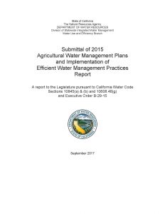 Senate Bill X7-7, the Water Conservation Act of 2009 (SB X7-7), requires agricultural water suppliers who provide water to more than 25,000 irrigated acres (excluding acreage irrigated by recycled water) to adopt and submit Agricultural Water Management Plans (AWMPs or Plans) to the Department of Water Resources (DWR) and to implement Efficient Water Management Practices (EWMPs), including two critical EWMPs: the measurement and volumetric pricing of water deliveries. These AWMPs were due by January 31, 2016. Governor Brown’s Executive Order B-29-15 required agricultural water suppliers that provide water from 10,000 to 25,000 irrigated acres to submit AWMPs by July 1, 2016.